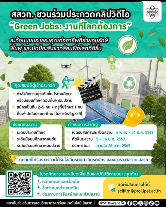 สถาบันส่งเสริมการสอนวิทยาศาสตร์และเทคโนโลยี (สสวท.) ขอเชิญชวนนักเรียนระดับประถมศึกษาถึงมัธยมศึกษาตอนปลายทั่วประเทศ ร่วมสร้างสรรค์คลิปวิดีโอ ความยาว 3–5 นาที ในหัวข้อ “Green Jobs: งานที่โลกต้องการ” เพื่อสะท้อนมุมมองต่อ “งานสีเขียว” ซึ่งเป็นอาชีพสำคัญที่ช่วยอนุรักษ์สิ่งแวดล้อม ลดมลพิษ และส่งเสริมความยั่งยืน ผู้สนใจสามารถสมัครเป็นทีม 2–5 คน พร้อมครูที่ปรึกษา 1 คน ส่งผลงานได้ตั้งแต่วันนี้ถึง 31 ธันวาคม 2568 โดยทุกผลงานที่ได้รับรางวัลจะได้รับโล่เกียรติยศ เกียรติบัตร และของรางวัลจาก สสวท. ประกาศผลภายในวันที่ 26 มกราคม 2569 ดูรายละเอียดเพิ่มเติมที่ https://sciencefilm.ipst.ac.th/contest ติดต่อสอบถามได้ที่อีเมล scifilm@proj.ipst.ac.th