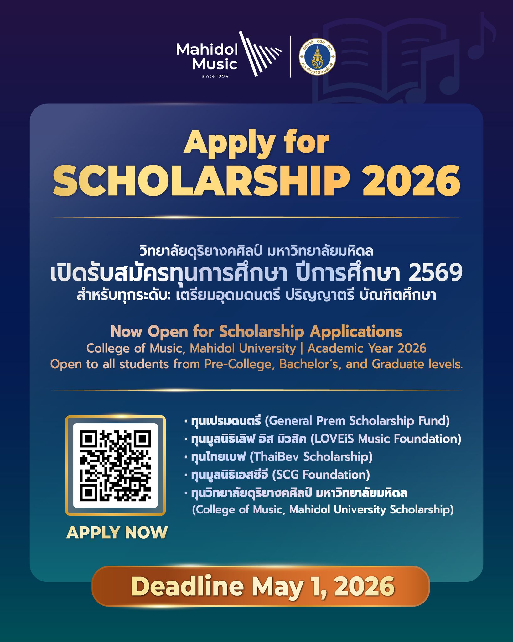 #MahidolMusic #MahidolUniversity #MusicScholarship #Scholarship2026 #ScholarshipOpportunity #CollegeOfMusicMahidol #MusicEducation #ทุนการศึกษา2569 #เรียนต่อดนตรี