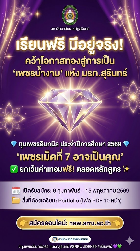 มหาวิทยาลัยราชภัฏสุรินทร์ (SRRU) เปิดประตูแห่งโอกาสครั้งสำคัญสำหรับ #DEK69 ประกาศรับสมัครคัดเลือกนักศึกษาเข้ารับทุนการศึกษา “ทุนเพชรอินทนิล” ประจำปีการศึกษา 2569 ภายใต้คอนเซปต์ “เพชรเม็ดที่ 7 อาจเป็นคุณ” มุ่งเน้นสนับสนุนเยาวชนที่มีความเป็นเลิศทางวิชาการและมีความสามารถพิเศษ ให้ได้เรียนฟรีโดยไม่มีค่าเทอมจนสำเร็จการศึกษา