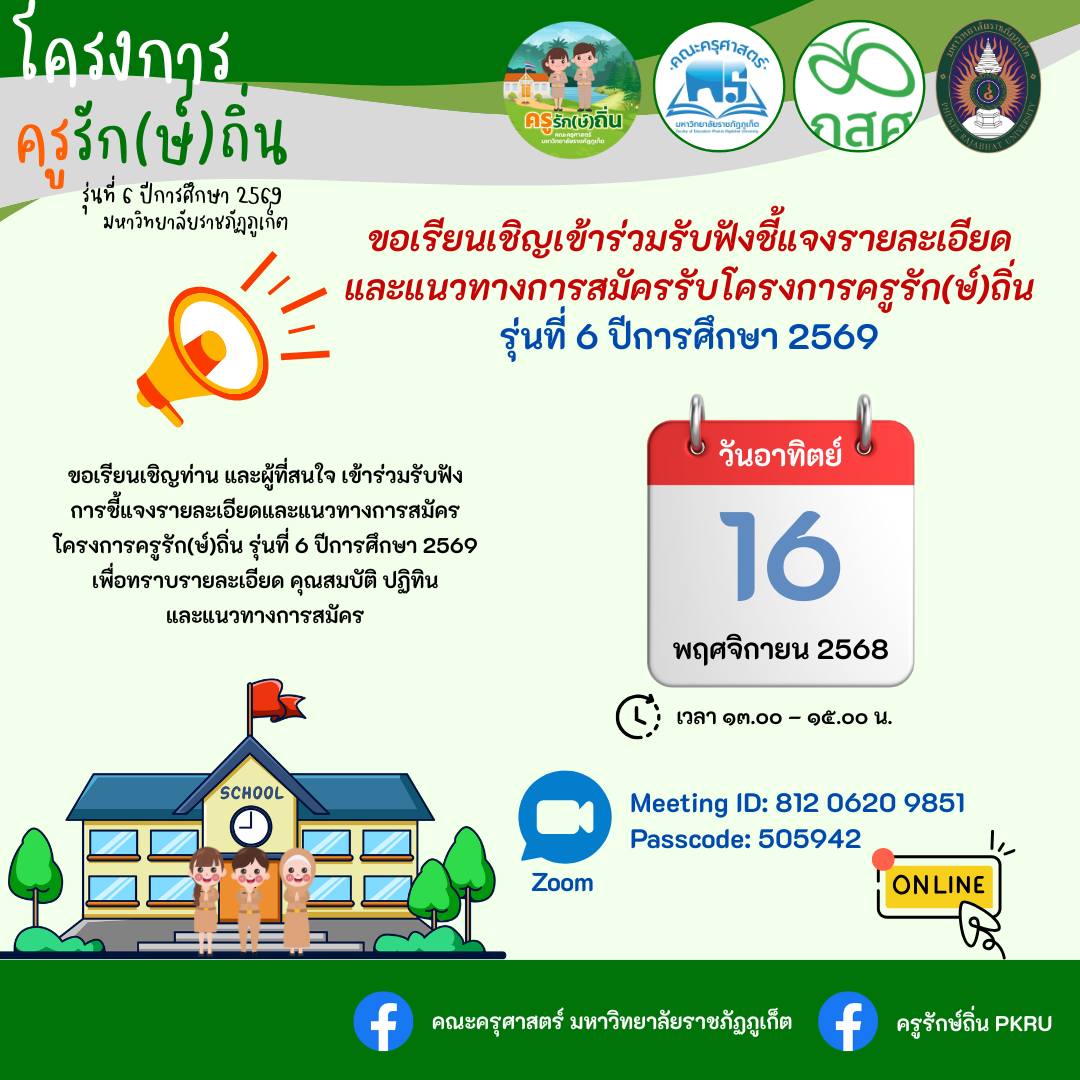 ขอเรียนเชิญท่าน และผู้ที่สนใจ เข้าร่วมรับฟังการชี้แจงรายละเอียดและแนวทางการสมัครโครงการครูรัก(ษ์)ถิ่น รุ่นที่ 6 ปีการศึกษา 2569 เพื่อทราบรายละเอียด คุณสมบัติ ปฏิทินและแนวทางการสมัคร